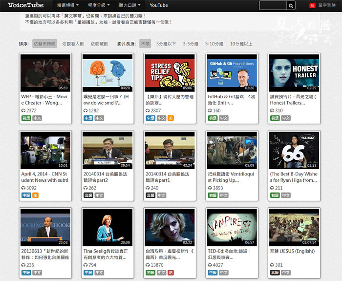 Hiccer發現了一 個非常不錯的免費影片網站Voicetube,裡面收集了非常多有趣多元的Youtube影片。