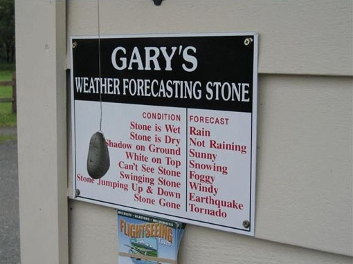 輕鬆一下...順便學英文 翻譯如下 : 情況 預測 石頭濕濕的 下雨 石頭乾乾的 沒雨 石頭下有陰影 晴天 石頭上白色物質 下雪 看不到石頭 有霧 石頭搖擺 有風 石頭上下跳動 地震 石頭不見了 龍捲風